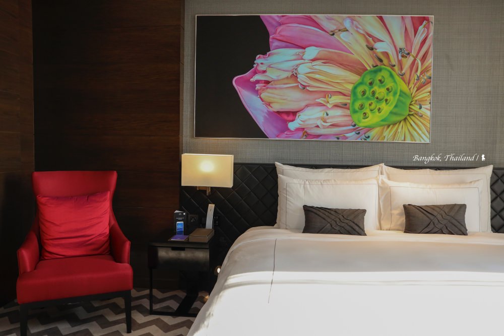飯店位於被稱為小日本的 Phrom Phong 區,鬧中取靜,有別於集團下第一家闖出名號清邁館的古典,二號曼谷館是時尚奢華,雖兩家風格截然不同,但雙雙都是「全球奢華精品酒店」(Small Luxury Hotels of the World)的成員。我特別喜歡從一樓大廳到 27 樓 Nimitr 高空餐廳延續使用的孔雀藍色調,華貴低調,讓人忍不住想一探細節。