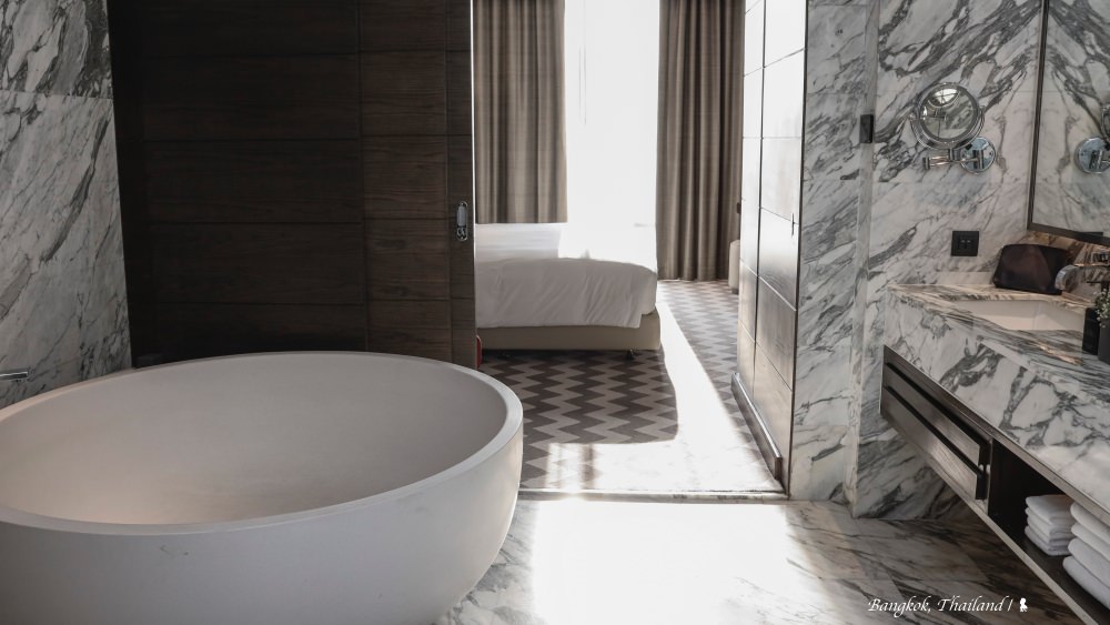 走向臥室的通道會經過一個衣帽間,行李箱、衣物等都能穩妥被安置在這。彷彿真像在家,臥室在就寢時有門可闔上,不會因空間太大而有一絲不安全感。四個類別的套房,浴室都統一配有專門打造、符合人體工學的超大圓形浴缸,浴缸儘管大但躺在裡頭能讓脖子輕易有依託,提供完美的泡澡體驗。雙洗手台的大理石浴室,氣派有質感,而特定房型的套房,浴缸還安排放在落地窗邊,亦是夢幻。