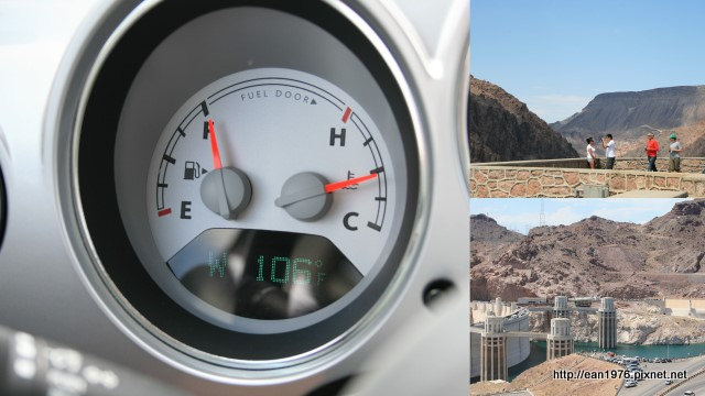 這是距離賭城拉斯維加斯不到一小時車程的胡佛水壩1935年竣工、名列世界七大人工奇景之一。(胡佛水壩有多厲害,請參考維基百科上的條列說明)。從Williams一路開車過來,溫度也隨之飆升,至此已經是到達放假標準的華氏106了(相當於攝氏41.1度)。