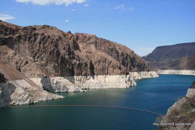 這是我這輩子第二次來胡佛水壩,上次是02’ 從賭城前來,不變的是那宛如火焰山的高溫,印象中也是下車拍拍照就趕緊上車吹涼。這次也是(我想若有下次,應該也還是),下午兩點多抵達,把車停好、下車後就像在閃避敵火網攻擊,提相機快跑前進的衝到旁邊的唯一一家紀念品店尋求冷氣掩護。才不過1分鐘的時間,感覺又從火熱地獄回到天堂「啊~好涼」。