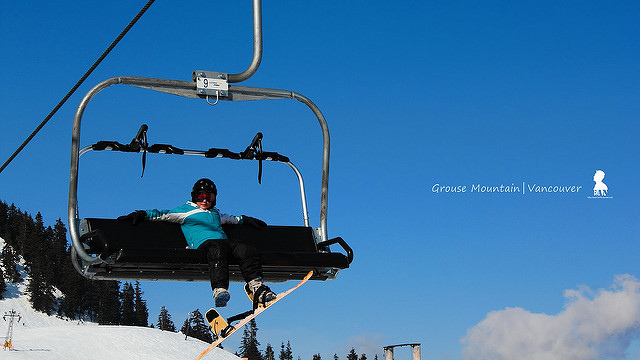 跟上次大費周章搭了海陸空三種交通工具(海=Seabus、陸=Bus、空=Skytrain)才抵達纜車站所不同,本次是開車上山,從所住的Burnaby 區開車到搭乘纜車的點竟然只需約25分鐘,也就是說當我在台北、若從淡水站搭上捷運過了北投站沒多久,我的同學已經要搭上纜車準備等著濺起雪花、帥氣的S型滑下(搥壁!)。溫哥華不愧是我最愛的淡水之豪華旗艦版啊!皚皚白雪大山與無敵海灣都不到半小時就能抵達,這塊土地也實在太受老天恩寵了。