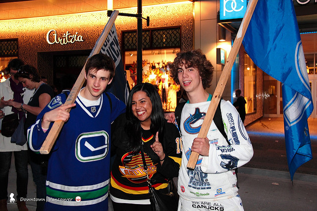 睽違17年,溫哥華的冰上曲棍球隊Canucks 終於又獲得史丹利盃的西聯冠軍,正和東聯冠軍隊伍波士頓棕熊(Bruins)進行七戰搶四勝來爭奪冠軍盃。繼6/1獲得首勝後,今天(6/4)再下一城拿到第二場勝利。當該場比賽一結束,溫哥華各處隨即鳴起凱旋喇叭聲慶祝勝利,市區更是陷入激情、儼然變成一場露天的大型慶功派對。
