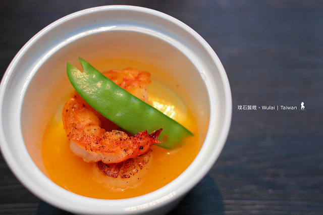 提到食如景,這家餐廳的菜單是會隨著季節更迭而調整,尤其對放在主菜之前的一道名為「巡守堰堤櫻花麵」留下深刻印象,光這名字就很有意境,三月的烏來山櫻爭妍,紅紅粉粉的沿著山路如團霧,取其意象、主廚用了紫蘇梅醃漬讓麵線有了山櫻的顏色,端上時靠近ㄧ聞像嗅到了春天的氣息。這是這頓餐的視覺亮點,至於味覺則是被另一道的「櫻蝦干貝玉子蒸」所驚艷,選用的蝦子與干貝口感很鮮甜飽滿,淋上南瓜醬汁的蒸蛋味道相當濃郁!