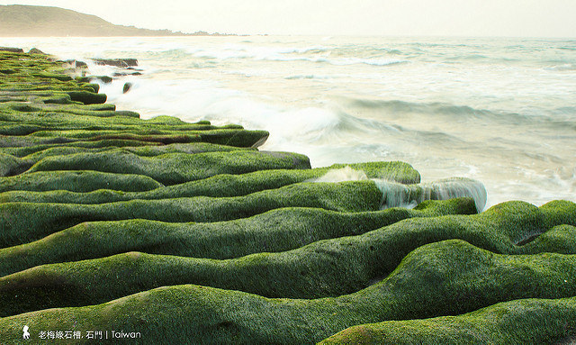一排排層次分明的綠長在海邊,很像山坡上的綠茶園,是之前未曾見過的景色、感到相當新鮮!在地理名詞中,綠石槽的名字是「海蝕溝」,據說是久遠以前大屯火山爆發後所遺留的火山礁岩,在海邊經長期沖刷後較鬆軟部分被侵蝕而留下今天這種溝槽模樣。而之所以每到春天都被上了色乃是因為冬季吹東北季風而讓石槽滋生綠色海藻,在春天於是成了這幅全台唯一的綠色海岸特殊景觀!(地理知識資料參考:交通部觀光局北海岸及觀音山國家風景區網頁)