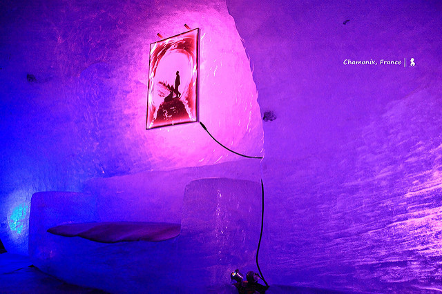 走進灰白中隱隱綻透冰藍色的Grotte de glace洞口,輕拍子的北歐電子音樂在這低溫凝結的空氣中是更顯空靈,搭配著從結晶冰層裡發散的五彩燈光,眼前所見是如此夢幻的不切實際,讓人忍不住張開手掌貼在厚實卻又透明的冰面感受甚至親吻,也可去坐坐鑿切的冰河沙發、感受小龍女的修煉。
