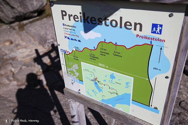聖壇岩還真無法順道而來。在看完擁有挪威最美峽灣之稱的蓋倫格峽灣(Geiranger fjord)後,從奧勒松(Alesund)搭乘國內班機飛到奧斯陸轉機抵達斯塔萬格(Stavanger)過夜,隔天一早於市中心搭約35分鐘的船到塔烏(Tau)小鎮,下船後再搭約半小時的公車抵達登山口開始步行。從登山口到聖壇岩距離3.8公里,沒真的很遠、但因是從海拔270公尺一路爬升到604公尺,中間少不了會有幾段是頗為辛苦的陡坡,不過在攝氏13度的九月晴天裡健行,算是相當舒服的樂事一件!最後是花了1.5小時攻上聖壇岩(下山是1小時10分鐘),說不累是騙人、中間大概休息兩次,但非常值得!