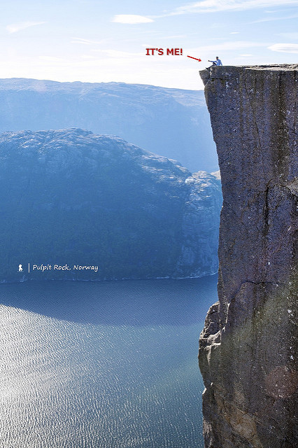 為 了一塊岩石,我搭乘了海陸空三種交通工具再健行攀爬專程來見。那是比台北101(509公尺)還高、以604公尺的高度垂直聳立於挪威西南部的呂瑟峽灣(Lysefjorden)上的天然巨岩,南非有桌山、北方的挪威則有這塊聖壇岩。因頂部是一約25公尺平方如教堂佈道講台而得名Pulpit Rock(註:Pulpit為講壇之意)。大概是台灣物價4-5倍的挪威,進入這個超級地景的門票竟然是0元,但從上俯瞰的壯麗風景絕對是無價!