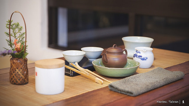 這次入住的是水閣區 Villa的「聚瑞」客房,一連6間成排的徽式建築(若我沒誤聽導覽人員的介紹),每間名字都取得雅緻,仁山、如意等。水閣區的房型是兩層樓共46坪,室內空間設計以木頭為主,一樓是客廳,中規中矩、沒特別花時間待在這,主要時間都在二樓臥房,挑高的空間木頭為樑,臥室雖大但不顯空,我很欣賞是窗台旁規劃成一提供完整茶具的榻榻米茶空間,既本業是茶自然提供給客人的就不會差,每間客房分別都有阿里山清香與熟香兩款烏龍茶,平常有在泡茶的我特別喜愛如此規劃。