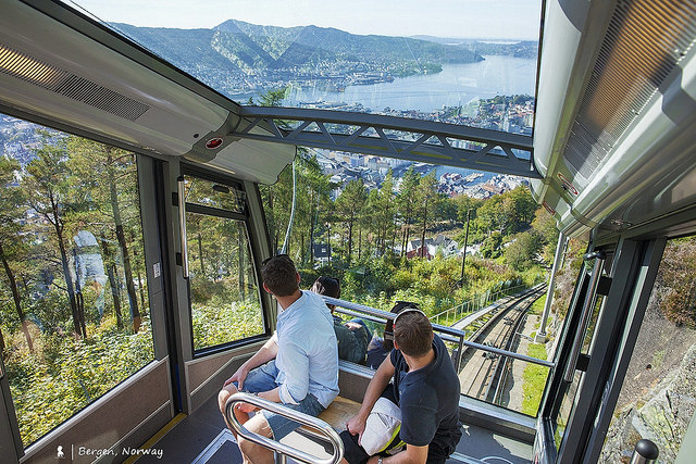 階梯式車箱座位、最大陡坡 26度,搭上這纜車只要 5、6 分鐘就可攻頂高 320公尺的佛洛伊恩山(Mt. Fløyen)