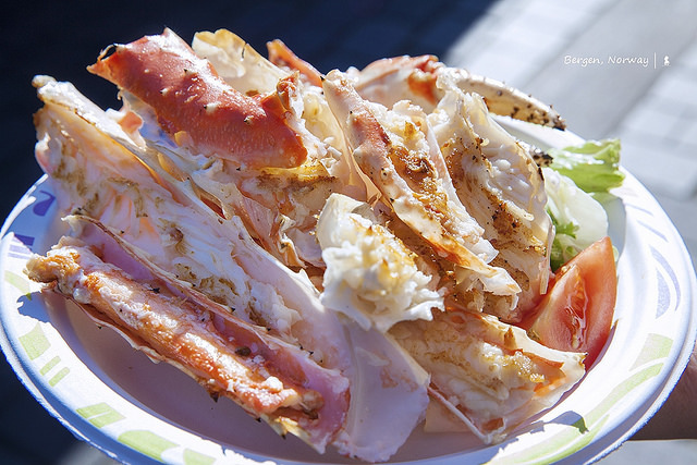 在物價是台灣4-5倍的挪威能省則省,但有一天菜值得揮霍一下,是卑爾根碼頭邊路邊攤賣的碳烤大蟹腳,那是我目前吃過最美味的螃蟹料理前二(另一是多年前在日本北海道吃的螃蟹全餐:http://goo.gl/tAjcHU),新鮮肥美的螃蟹肉經過碳烤,好滋味教人難忘。