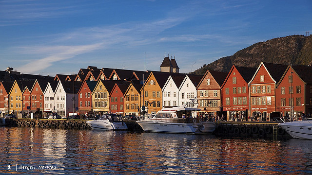 每天到了下午時分,老天爺就會用光線為卑爾根鱗次櫛比的數百年歷史建築在水面上作畫