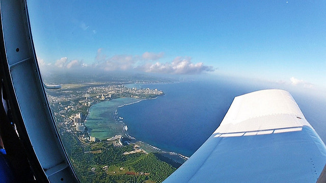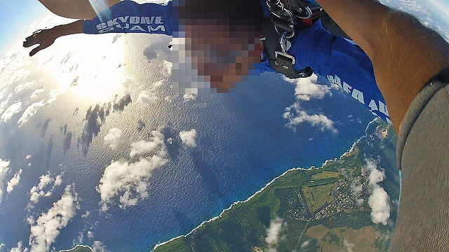 萬元有找的關島高空跳傘沒想像中貴,若嫌8000英呎不夠看可加價向上提昇高度、最高可從比玉山還高的14,000英呎(約4,267公尺)跳機,主要差別是決定自由落體時間的長短,我直接攻頂從14,000英呎一躍而下,自由落體長達約1分鐘的時間,沒想像中害怕反倒覺得舒服,或許是早已超越人類害怕的高度,上一秒還驚慌、下一秒就完全被眼下的風景震懾而分了心忘記要緊張,無邊的湛藍色包圍蝴蝶形狀的島嶼,上頭還飄著幾朵雲迎接旋即掉落準備穿越的我。沒多久傘打開,風切聲霎時不見、世界也彷彿慢了下來,緩降漂浮著觀看腳下這座迷人島嶼,好美。