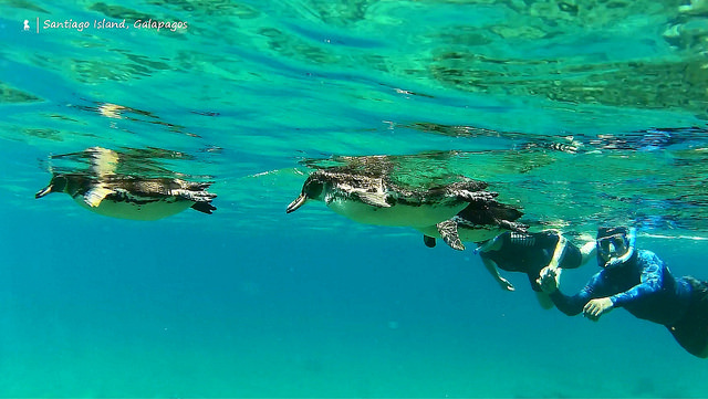 驚喜的還有,在Sullivan Bay浮潛時,我與三隻企鵝同游了好一下,這群嬌客是緯度最北的企鵝品種,因著秘魯洋流而能生活在此;在Santiago島浮潛的那個上午,原本一隻在礁岩休息的海獅看見我們,就像個喜見新朋友的孩子,扭動身軀躍入海面從身旁游過,陸地移動緩慢但遁入水中馬上變成游泳高手,即便我使勁全力追趕還是只能望背影興嘆。