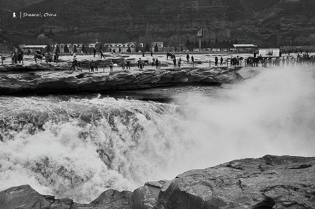 「收來一壺水,放出半天雲」,佩服古代詩人僅用短短十個字,就能生動描述出我筆墨難以形容的壯觀景致。壺口瀑布的生成,乃是原本兩岸夾山的滔滔黃河,當原本三百公尺寬的河面突然收束只剩五十公尺,最後又從廿多公尺高的斷崖飛瀉而下落在卅公尺寬的石槽峽谷中,波浪翻滾、驚濤怒吼,景象狀似巨壺沸騰,因而得名。