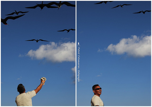 倒數第二天的傍晚,Henry 熱切的喚我們上第三層的陽光甲板,只見右手高舉衣服揮舞的他,像個孩子般調皮的笑著,我仰頭把視線調升45度角,神奇的事發生了,包括軍艦鳥等近十隻的大鳥就這樣展翅跟著我們飛翔前進,Henry 手上像拉了十來條隱形的線牽引著牠們,原來不是線是那件衣服,讓大鳥們誤以為是食物來著了。