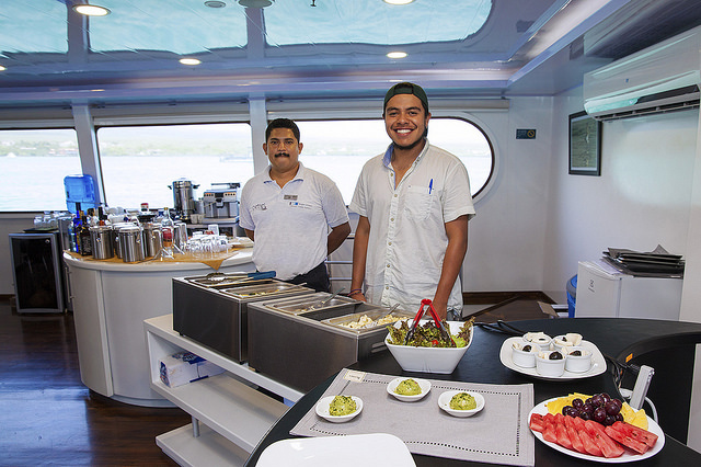 位於赤道的加拉巴哥天氣總是炎熱,每每從橡皮艇回到海燕號,服務人員會第一時間奉上冰涼飲料,下午時間還會加碼提供可口的炸物點心,幸福的幾乎升天。