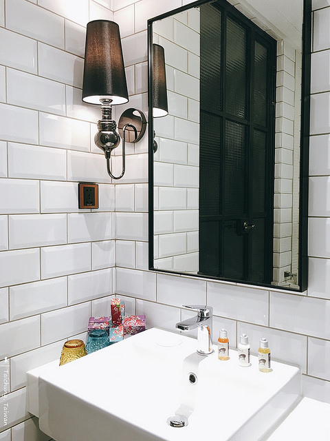 走入房間,靠近門的這半與浴室地板舖設的是馬約利卡磁磚(Majolica Tile),那是日據時期在1920-1940台灣民宅所流行使用的花磚,散發著屬於舊時代的和洋美感。再往裡走就多了點紐約蘇活區的loft工業風,寬版的木地板、紅磚裸牆、鋁製寬口垃圾桶,還有美國太空時代盛行的復古按鍵式電話機,許多細節都照顧到,不馬虎。同樣的細緻也表現在浴室,呈現的復古氛圍主要是來自牆上被稱為紐約地鐵磚(Subway tile)的白色長方磚加上地板的馬約利卡磁磚,此外搭配使用了傳統的彩色圖樣玻璃杯與客家花色包裝的備品組,調性一致。值得一提的是,儘管是老飯店改裝,但淋浴的水壓很強、溫度也很快到位,肯定下了功夫。