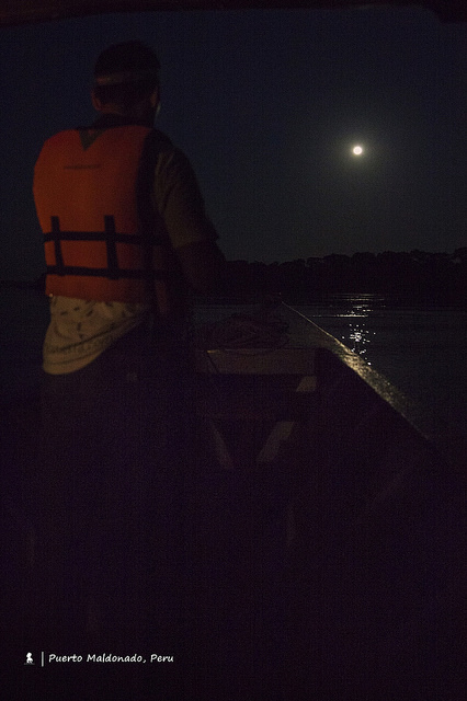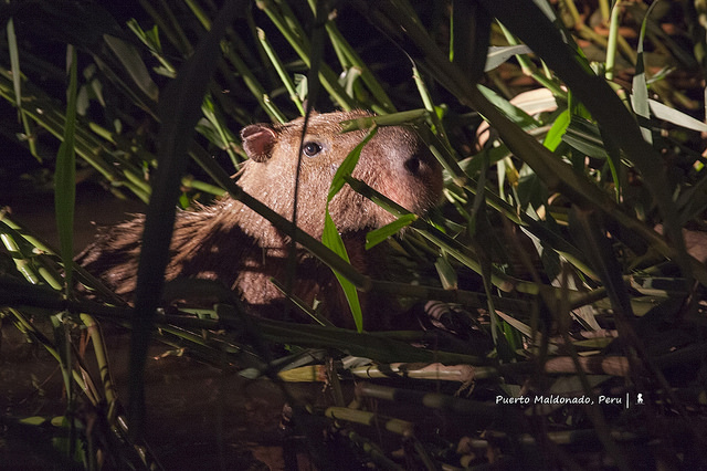 說到了夜,抵達那天在晚餐前安排的是搭船遊河夜訪鱷魚,數量不如預期多只看到一隻,不過另加碼了體型最大的嚙齒類動物:水豚(Capybara),窩在水邊的草叢裡。其實那晚的驚喜倒非暗藏水面下,而是水面上明亮的一輪明月,以及在Madre de Dios河上拉曳出的一道黃色光影,晚風吹拂、無車馬喧囂,此景難見更難忘。