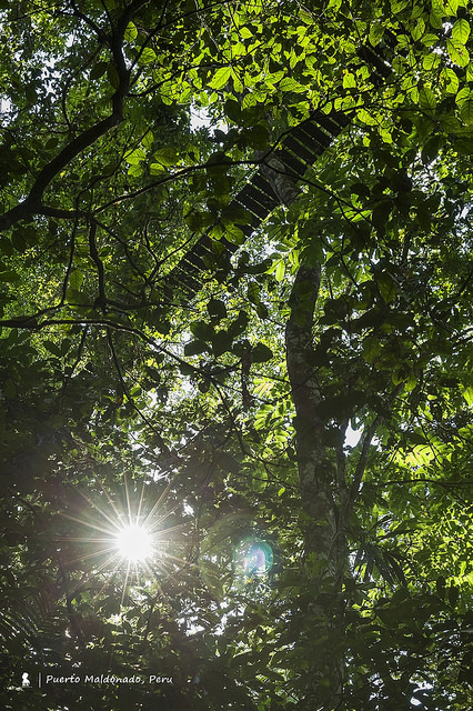 仔細看,樹隙間有道橋從上而過,這是祕魯亞馬遜叢林高約十層樓的樹頂橋,午後兩點的陽光從上灑落,很美!
