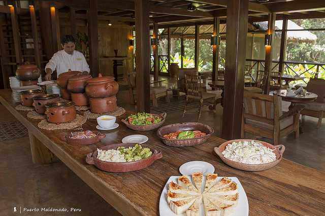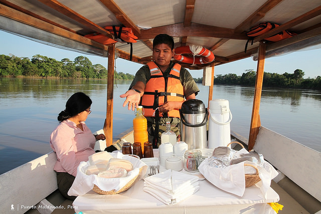 大自然的驚喜總是超出行程表上所條列,於是養大胃口決定額外支付費用在要離開的早晨加碼一個特別行程:跟金剛鸚鵡一起吃早餐。為了要觀賞早起的鳥兒,那就要比牠們更早起。於是清晨4:10起床、04:30 摸黑上船,一小時的船程順道欣賞了亞馬遜河的晨曦,魔幻又靜謐。早上六點不到,上百隻藍綠色的金剛鸚鵡聚集在岸邊的樹上,像分好小隊的輪流飛到紅棕色牆面開始吃土,後來才知道,原來金剛鸚鵡是在舔土牆以補充所需營養。早餐秀結束後,船長把引擎暫時關掉讓船順著水流飄著,一頓清幽的亞馬遜河早餐盛宴隨之展開。隨船的服務人員把摺疊木桌子攤開並舖上白色桌巾,拿出一一事前準備好的豐盛餐點有三明治、豬肉、蛋糕、水果、木瓜汁,就連熱咖啡或熱茶都一應俱全,這精緻又貼心的服務頗有安縵度假村的級數。