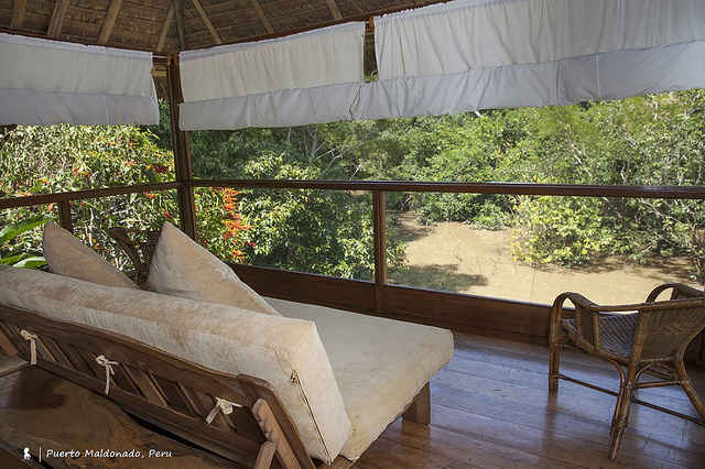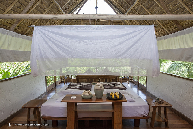 這頓亞馬遜河上的早餐,讓人以最舒服的狀態與原始自然為伍,這也是我這三天兩夜入住Inkaterra Hacienda Concepcion 的感受。最後要來介紹這個度假村,如一開始所提是沒有冷氣,不管房間或公共空間,這算是此行最辛苦的地方,但想想、也因此能更加貼近自然,可藉由溫度來感受不同時間的亞馬遜叢林,感受更加深刻。本次住的房型是 CABAÑA,這個用茅草做屋頂的挑高獨棟小木屋非常雅緻,每棟隨坐落位置擁有不同景觀,所住這間隔著大面落地紗窗與一片沼澤對望,房間內沒有電視,坐在房間木板上看著外頭全天候不收播的動物頻道精采有趣,完全不嫌膩,最棒是完全環繞立體聲,因與大自然只相隔一層紗窗。