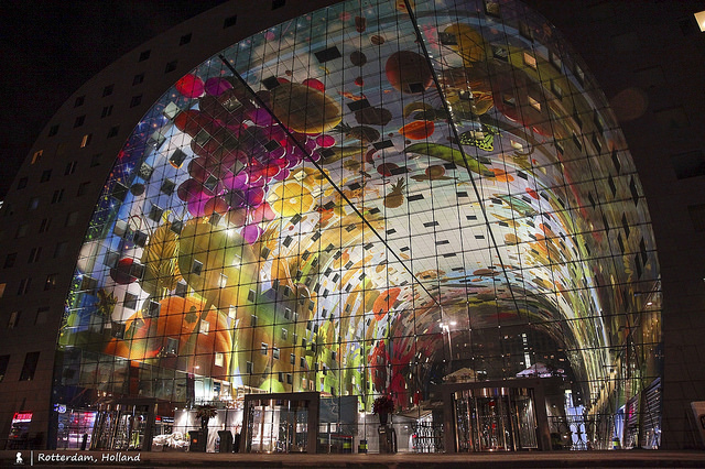 ↑ Markthal 市集廣場,由荷蘭知名建築團隊 MVRDV 設計,一個室內的生鮮市集廣場結合住宅功能的設計,開幕後馬上成為鹿特丹新地標,更被國際媒體票選為 2015 年全球最佳旅遊景點,同時也被英國《衛報》選為歐洲十大美食廣場之一