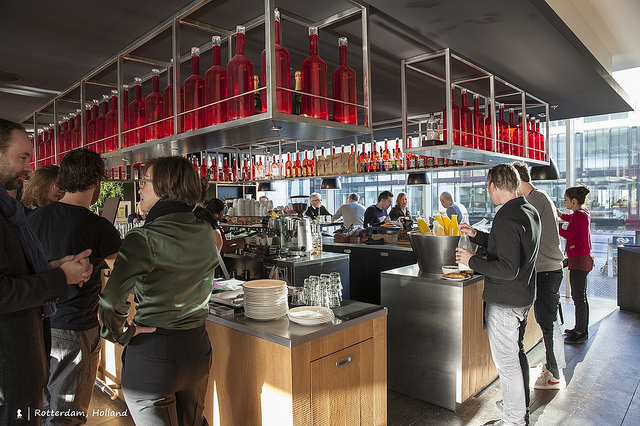 當晚後來散步去夜訪附近的Markthal 市集廣場與最美麥當勞,回來旅館已午夜十二點但意外卻聚集了大批穿著有型的男女在二樓的Bar(隔天早餐也在這吃),好奇詢問旅館服務人員,原來是當地正舉辦「Art Rotterdam」活動,有一設計師在此舉辦party,調性的確非常合適。