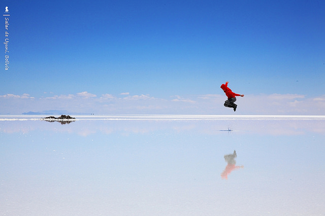 這說的天空之鏡,是玻利維亞的烏尤尼鹽沼,是世界上最大的鹽沼,10,582平方公里面積有快40個台北市或近1/3個台灣那麼大!有水處,看來就像面鏡子,天空多大,這面鏡子就有多大。