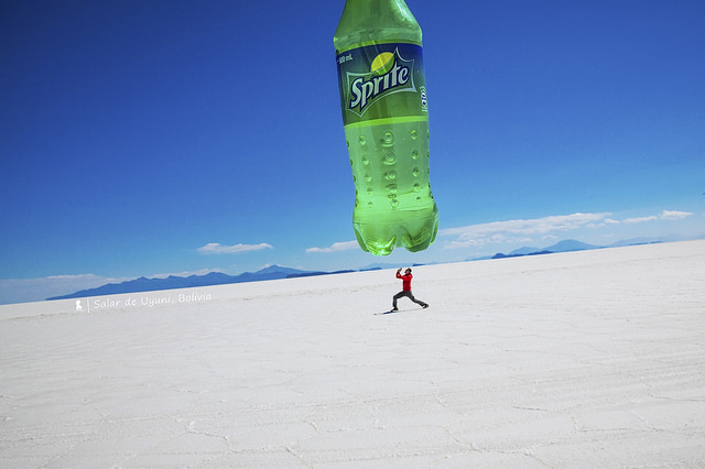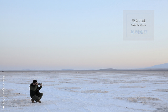 拍完日出,7點回飯店補眠,10點出發坐上導遊的車,找水去,找不到水就等於看不到天空之鏡,儘管已選擇在12-3月的雨季前來,積水處仍像沙漠綠洲一樣難尋。終於來到積水區,換上導遊提供的雨鞋準備入鏡,對了、高原原本紫外線就強,加上這如雪地的純白世界,墨鏡與防曬千萬不可少。
