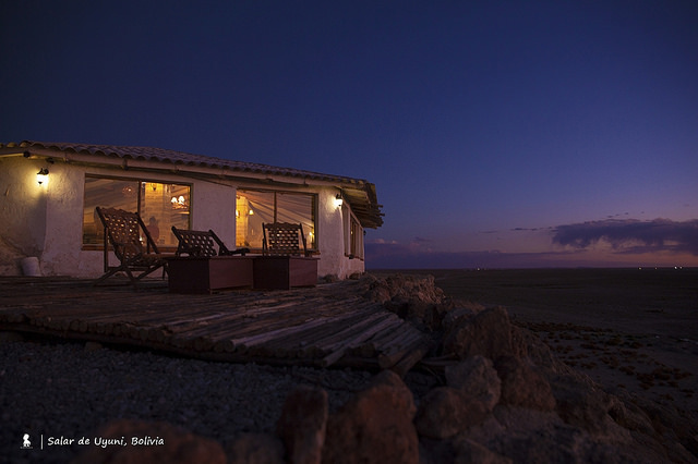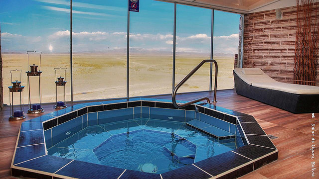 ↑ 外面大片無邊的是鹽沼,著名的玻利維亞烏尤尼天空之鏡,不過前幾日沒下什麼雨讓這景象反倒有些蒼涼孤寂,泡在 jacuzzi 欣賞這地景,是非常特別的旅遊體驗