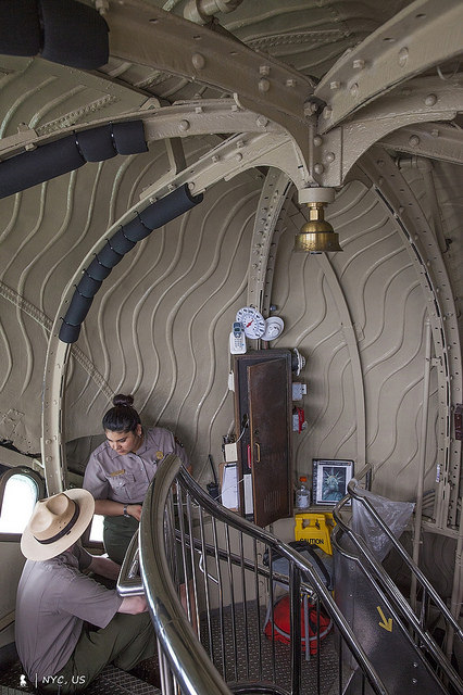 除要有機緣也得有精神,要登上自由女神的皇冠俯瞰,最後一段沒有電梯、只能小心翼翼的爬階而上,一共146級。因內部空間狹窄,拾階而上時的高度也僅約1.8公尺,因此特別規定,參觀時只能攜帶相機跟水(背包到時需要另外寄放),而這個只能帶水跟相機的規定,這趟美國行後來另一個景點也再遇到,是在景色截然不同但一樣狹窄的羚羊峽谷。