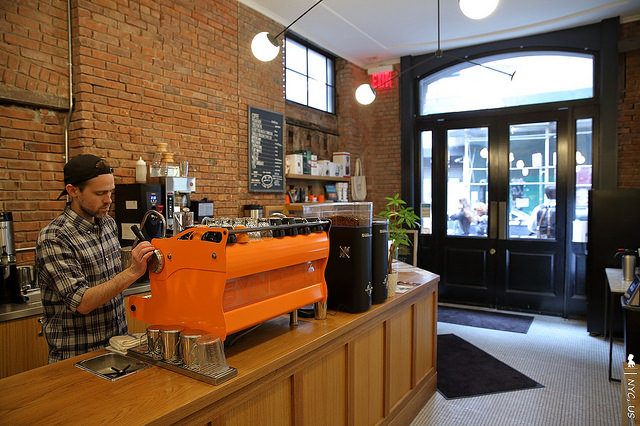 店內空間不大,紅磚牆、白色的小片馬賽克地磚,同咖啡店代表色的亮橘色義式咖啡機 Synesso Hydra是店內的視覺重心,搭配粗礦斑駁的紅磚牆,感覺蠻有溫度,同樣讓人覺得溫暖的是,Café Grumpy每年都會提撥 25% 的利潤捐助給當地、美國國內及國際的慈善組織,主要用於關心環境、照護有需要人士、社區及動物,同時也贊助藝術相關領域。