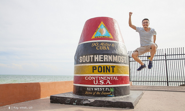 請 心裡想著美國地圖,東南方有個伸出美國大陸板塊的可愛小雞腳,邁阿密是點在右下的痣,接下來,我要跨海穿過近百座小島、來到美國本土的最南端,一個距離古巴僅 90 英里的小鎮:Key West(西礁島)。因行程緊湊,當初規劃時只允許在 Key West 過一夜,後來實際走訪覺得太可惜,事後諸葛會建議至少待上兩晚。