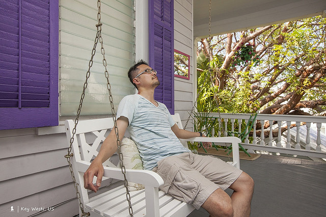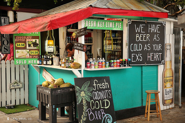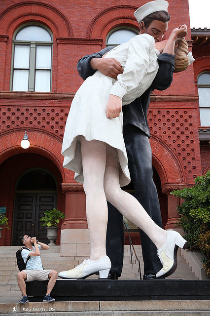 Key West 是個非常合適步行的小鎮,從住的旅館出發,著名的海明威故居與漆上紅黑黃的美國最東南端地標等都走路可到,賞心悅目的小鎮風光讓散步成了享受,且驚喜不斷。可能是南方的慢節奏,讓人的幽默感自然流露,一個路邊的啤酒小攤掛出的牌子寫道「我們這的啤酒跟你前任的心一樣冰涼!」(WE HAVE BEER AS COLD AS YOUR EX’S HEART),多到位的幽默文案;我在海明威故居外看到台專賣椰子的拖車,上前買一顆來解渴,老闆是位女生,沒拿出大刀來剖、竟是拿了把電鑽朝椰子鑽了個洞,就在我吃驚的嘴巴尚未閉上時,電鑽老闆很快插了根吸管,完成了這原本應該吃力的工作,嗯…這幽默帶點黑色。過了一個轉角又是驚喜,相信大家對一張海軍軍人在紐約時代廣場擁吻護士的歡慶二戰結束照片不陌生,在這變成超大的立體藝術裝置,巨大的尺寸逼得大家都成了仰頭就看見護士底褲的偷窺狂,嗯…這幽默,是粉紅色的。