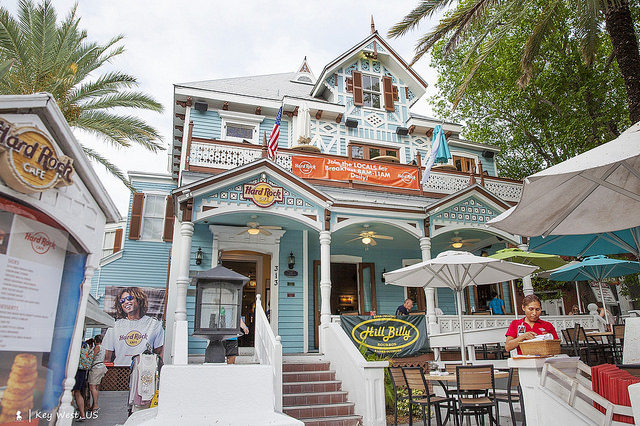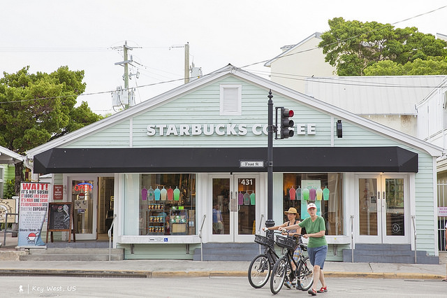當車子開進入 Key West,有種走入懷舊電影裡的錯覺,搖滾的 Hard Rock Cafe、都會風的星巴克、色彩鮮豔的溫蒂漢堡,來到這,通通變了樣,統一換上彩度較低的美國南方鄉村風住進了低矮木房子,原本需嚴格恪守的企業識別色與 guideline 都被放在一旁,只剩 logo 稍可辨識,一下子像穿越回到半世紀前,這種樸實感我很喜歡,時間發條也自動被鬆了幾格,放慢的感覺,真好。