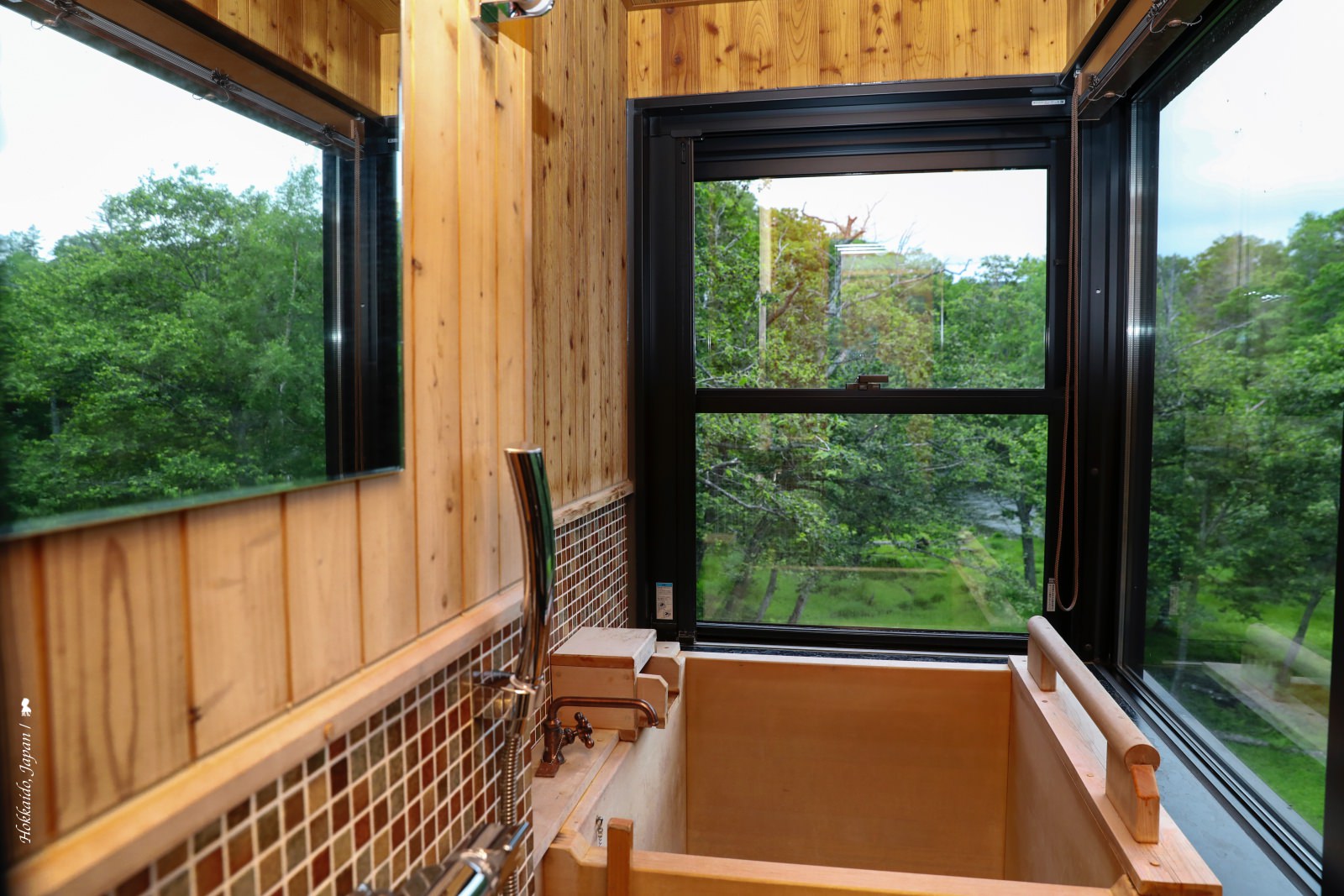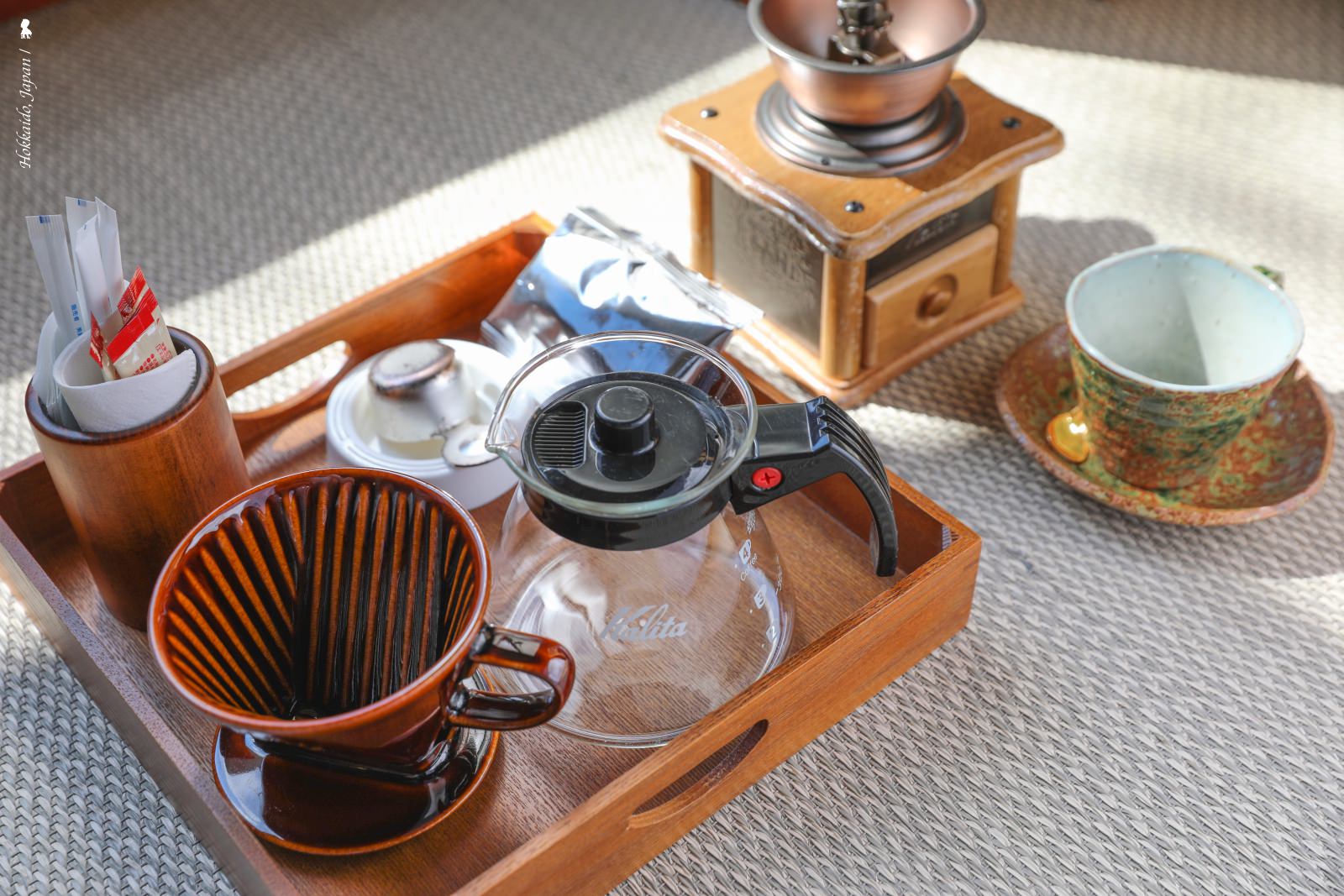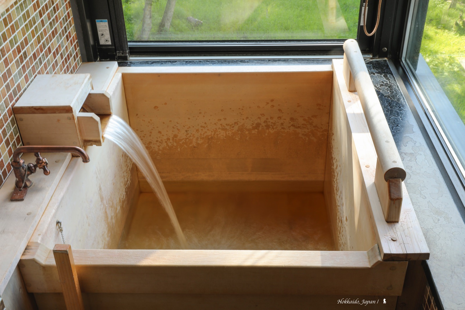 涼,是北海道的緯度與英國倫敦相當,在台灣動不動就破 35度的溽暑,來到道東還得加件夾克的十多度,舒爽極了!這樣的溫度,即使在夏天,還是很適合泡溫泉。這家旅館的溫泉絕對要三泡起跳。全館 64 間客房內都配有檜木池,身子泡在溫泉裏,把窗子往上推,外頭就是阿寒川與森林,特別是在陽光斜照的清晨,用溫暖泉水與泊泊水聲讓靈魂跟著甦醒,若還有什麼比這更愜意,那肯定是接著自己動手來沖杯好咖啡了!非常難得的,房間內除有常見的泡茶組,同時還很講究的提供咖啡豆、手搖磨豆機及手沖濾杯與濾紙。撕開、倒進咖啡豆,當右手搖磨豆機的那刻起,時間彷彿也在規律的旋轉中給慢磨了下來,好感謝旅館的用心,讓我用這杯醇香的咖啡來記住這個早晨的美好。