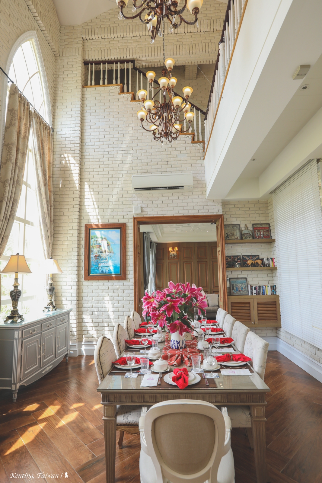 而這張十人座的華麗餐桌,也是我們最常待的地方,不管是午餐客房服務的一人一碗招牌青花瓷台灣牛牛肉麵,還是隨意手沖咖啡或泡壺好茶共享,還記得那晚我們坐在這聊天,每當有家人從旋轉樓梯緩步而下,那氣勢,頗像在錄大陸的實境節目,後來,聽別墅主人說才知道,2020 年播出湖南衛視林志穎跟媽媽、老婆錄製的「婆婆和媽媽」實境秀,還真的就選擇我們入住的這棟別墅花了好幾天拍攝(可參考報導)。