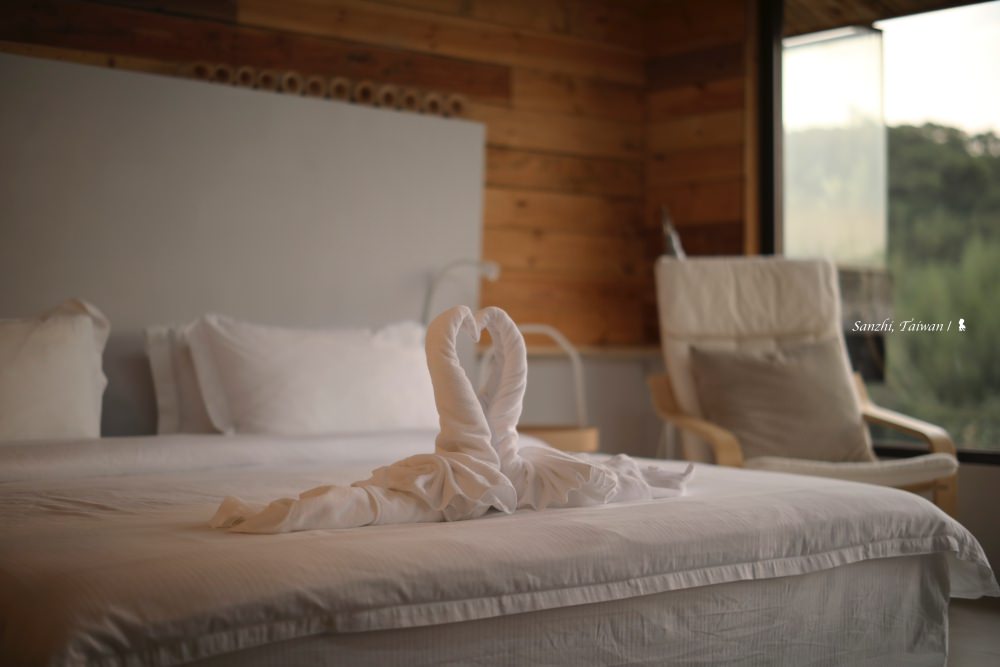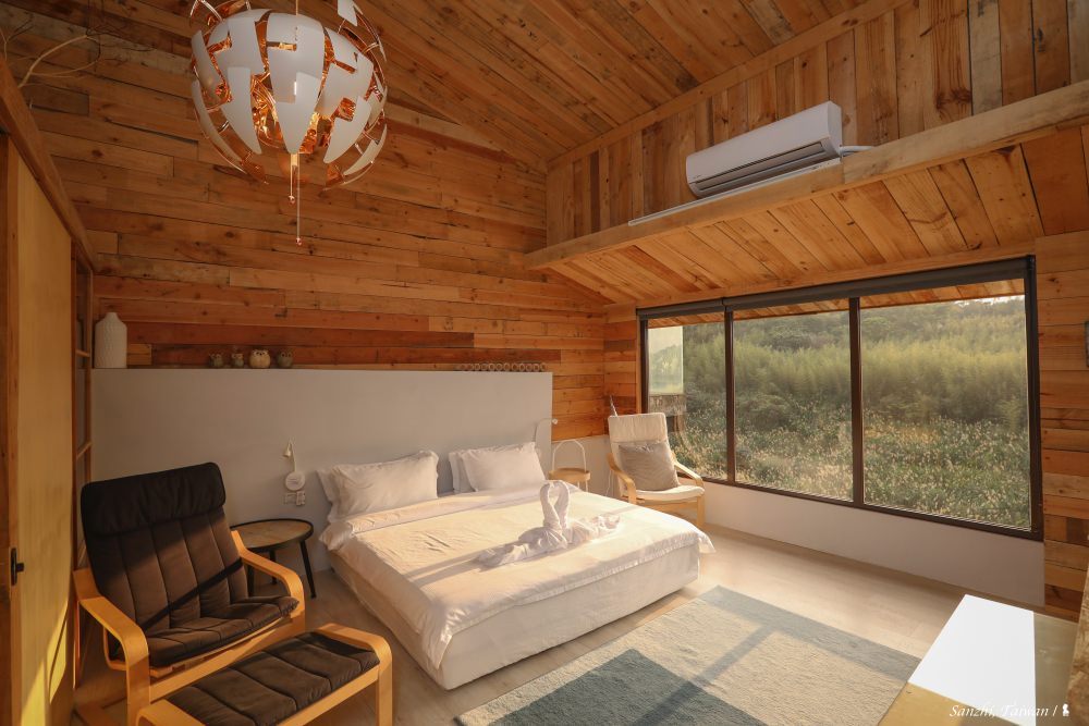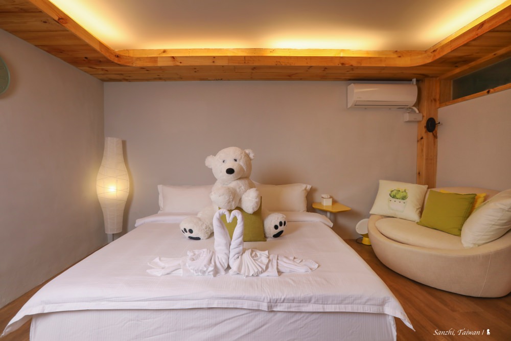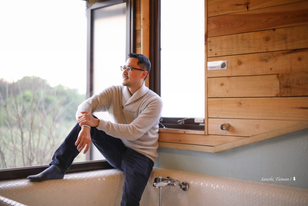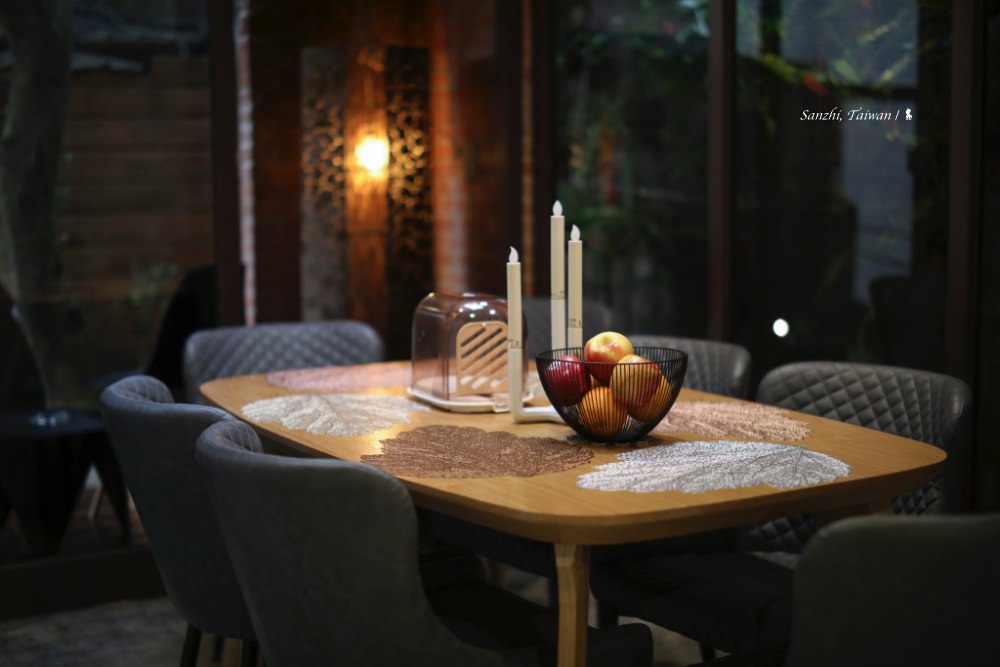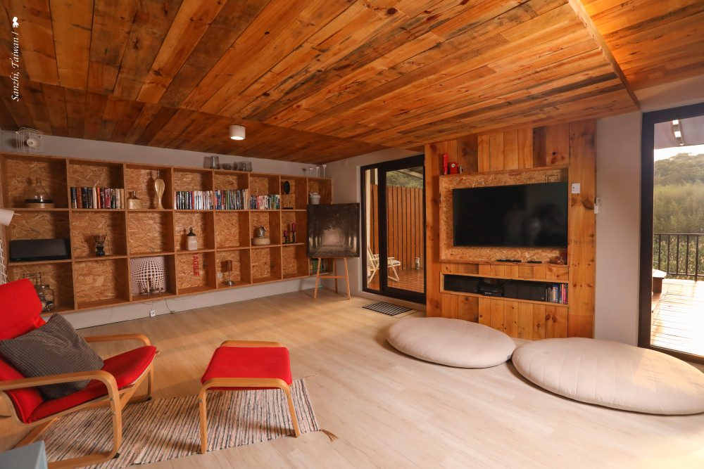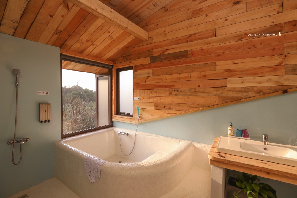 三芝 5+6 行館距離淡水車程約半小時,藏身在很富藝術氣息的芝柏社區裡,頗為幽靜。獨棟房子有三層樓,只規劃三房兩廳還有一個大陽台,住起來相當寬敞。主臥室位於大門進來的一樓,位於整棟建築的最高處,傾斜屋頂挑高,房間與浴室相連,特別打造的大浴池可容納四個成人,可說是帶山林景觀的室內湯來著。若只有兩個人來,就會安排入住這個房間,另外還可使用樓下的客廳、餐廳與廚房,很難相信若是平日入住,兩人只要 NT$ 5,800 即可包棟過上一晚隱居山林的品味豪宅夢。