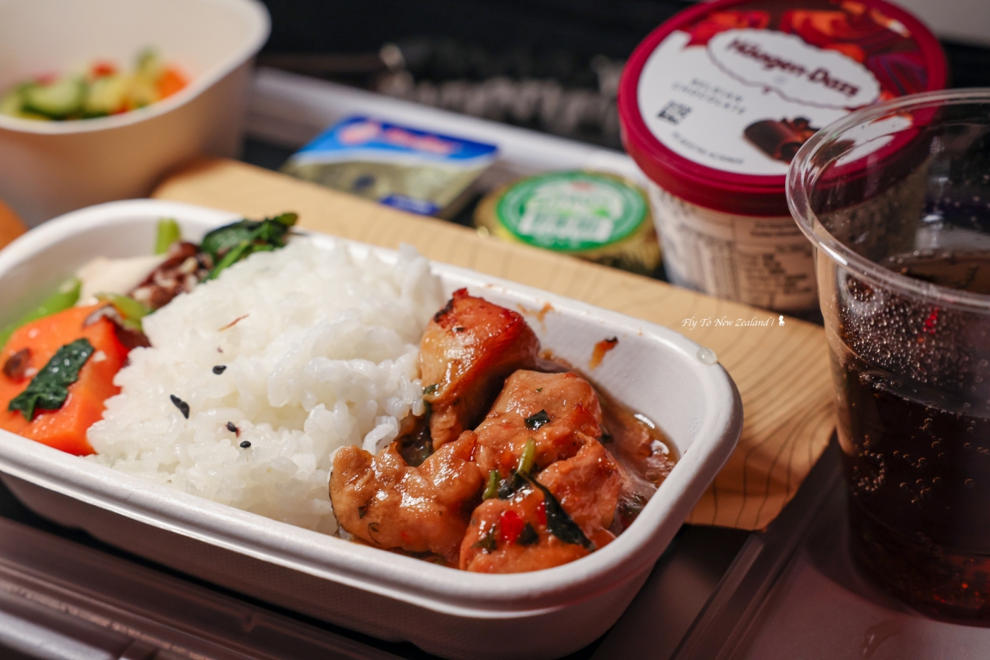 從桃園機場前往奧克蘭的航班時段很不錯,晚上 6 點多起飛,航程約 10 個小時,隔天早上約 9 點降落(紐西蘭快台灣 4 小時),在機上睡一覺就到了!去程我是搭乘經濟艙,讓我印象比較深刻的是,提供中文介面的個人娛樂系統是一上飛機就能使用,蠻好打發時間,此外每個座位都有插座可充電,這對長途飛行蠻重要。餐點部分,從桃園起飛提供的是中式料理,我搭乘的航班提供了三杯雞飯與川味豬肉炒麵,我選了前者、蠻合口味,餐後還有哈根達斯冰淇淋。讓不少朋友會很開心的是,就算搭經濟艙一樣有紅白酒可享用。