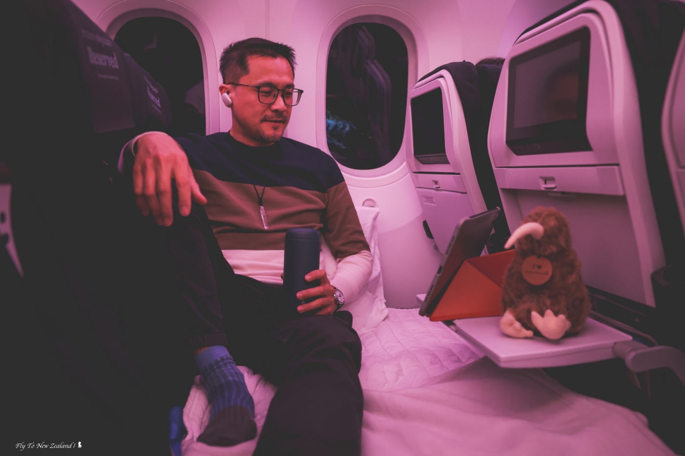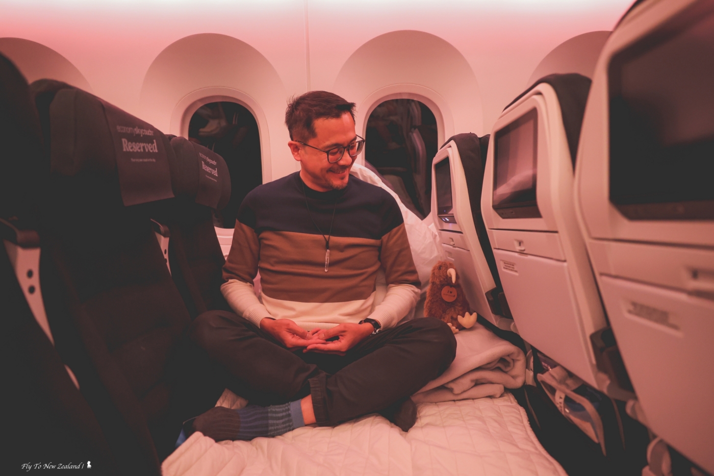 ⇑ 帶上出發前喜獲的紐西蘭航空吉祥物 Kiwi Bird 同行,彷彿一塊在空中沙發上靜坐