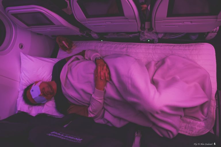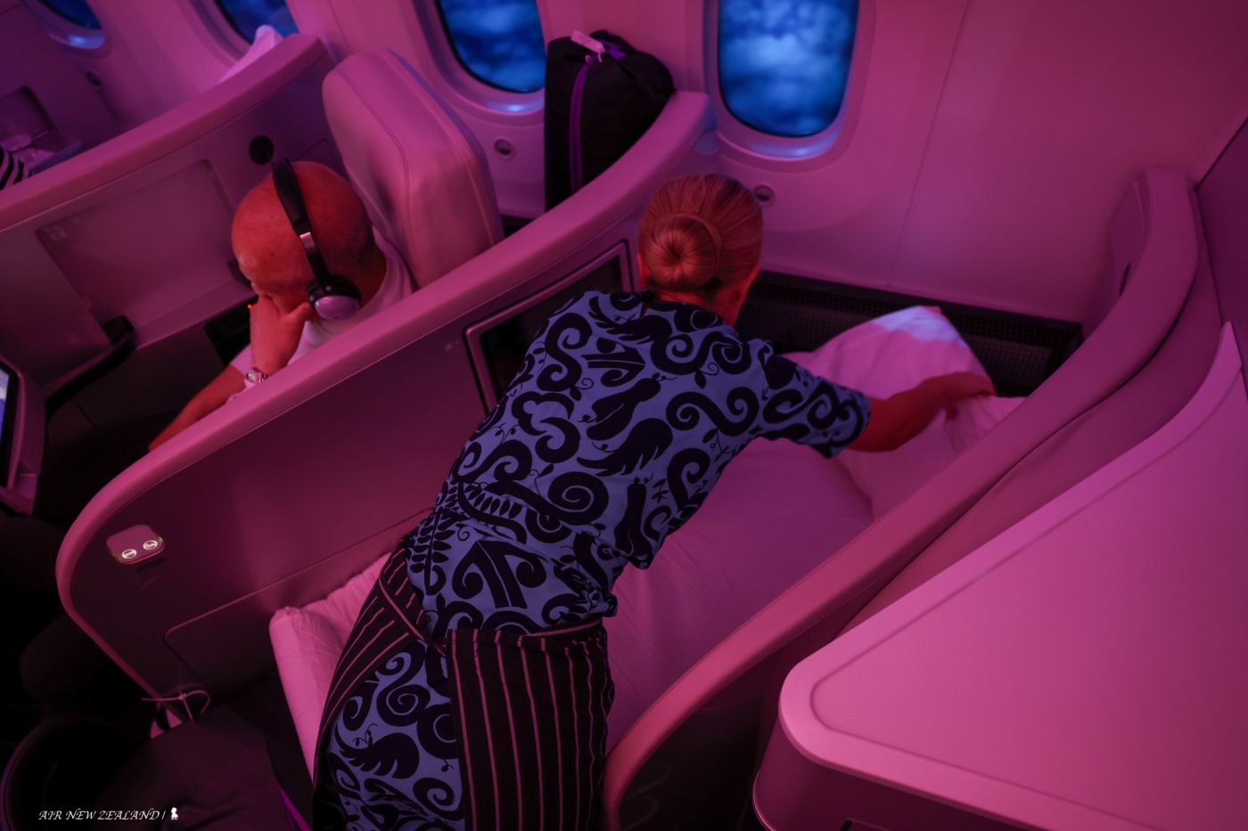 紐西蘭航空的商務艙有機關,要睡覺時可請空服員協助操作,一下子,柔軟舒服的真皮座椅就能變身成為可完全躺平的豪華睡床!更貼心是,他們還會準備床墊外加質感輕柔的羽絨被及兩個枕頭,超過 10 小時的飛行能如此舒適的一路躺回台灣,只能說再幸福不過了!