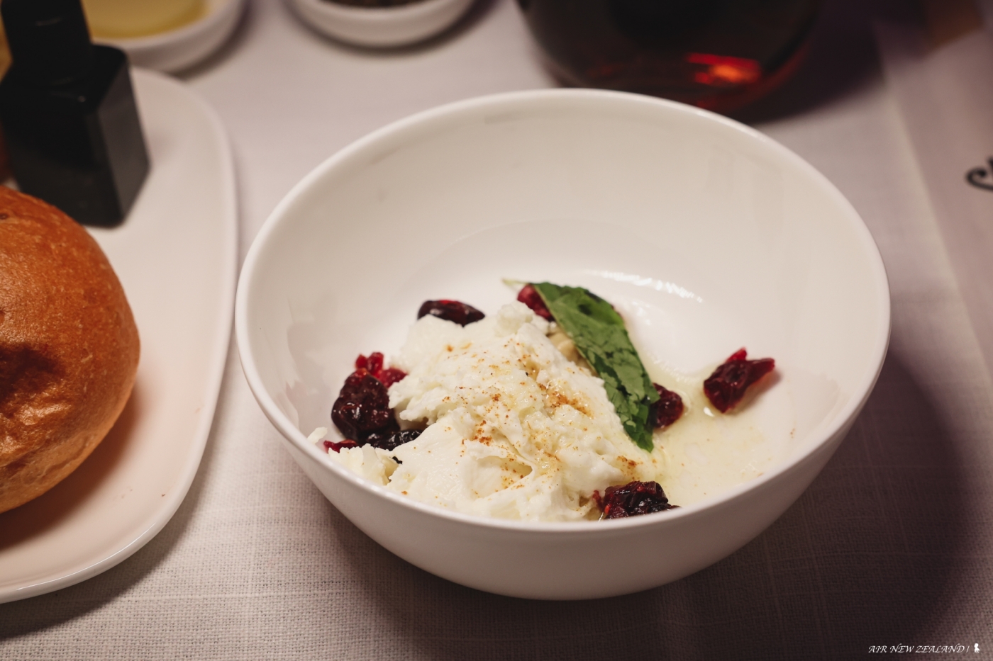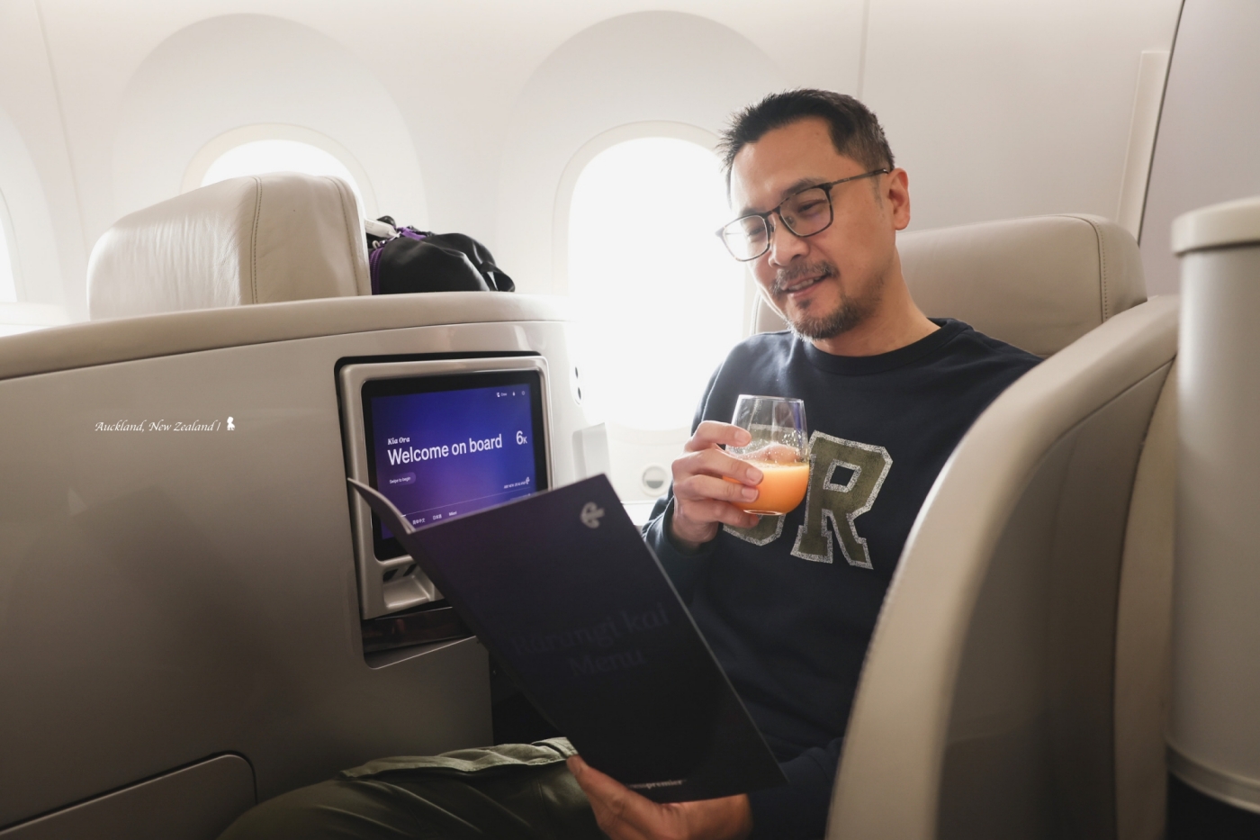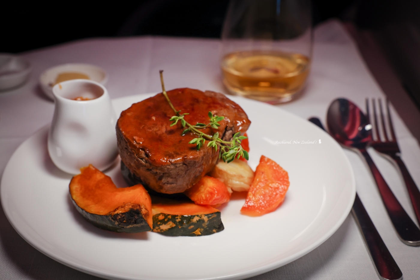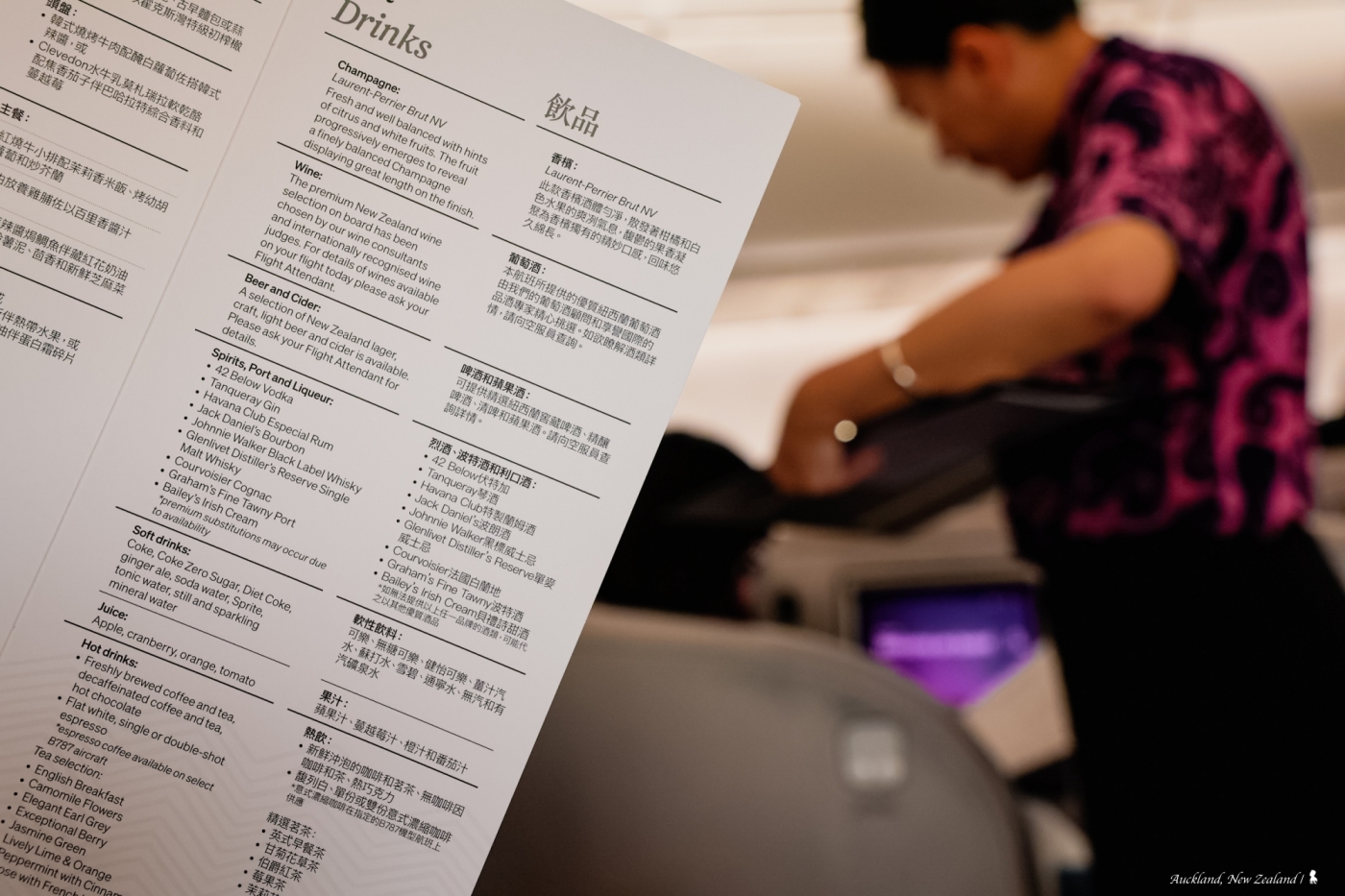 商務艙的餐點相當精緻,提供多款飲料與特選美酒,用高空西餐廳形容一點也不為過,不只美味,還能嚐到紐西蘭的在地食材,像是有道開胃菜就提供了紐西蘭的瑪茲瑞拉起司,讓我能透過舌尖細細回味著綿羊國的純淨天然。