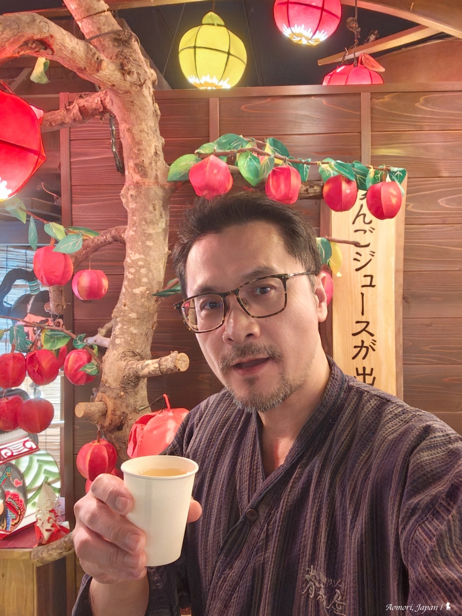 退房前,我把握時間又泡了一次溫泉,接著再去轉開蘋果樹上的水龍頭,喝了一杯青森蘋果汁。從第一口到最後一口,這趟在青森屋的時光,就像這杯蘋果汁一樣,簡單、真實,卻讓人記住它的味道。溫泉的暖、祭典的熱、花笠的色彩與燈籠的光影,都在心裡留下了屬於青森的層層印象。