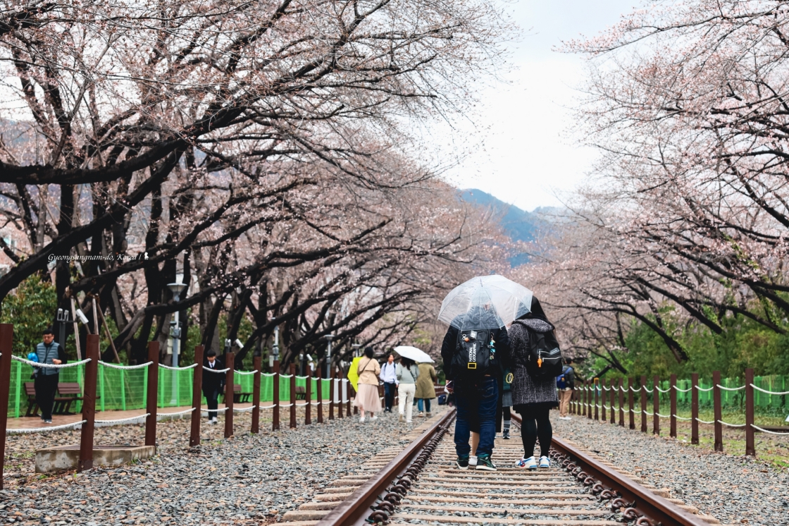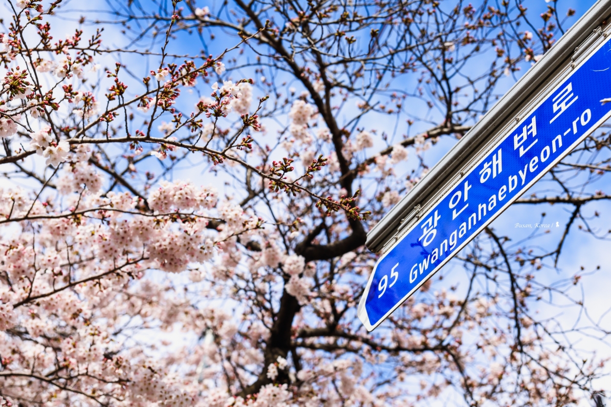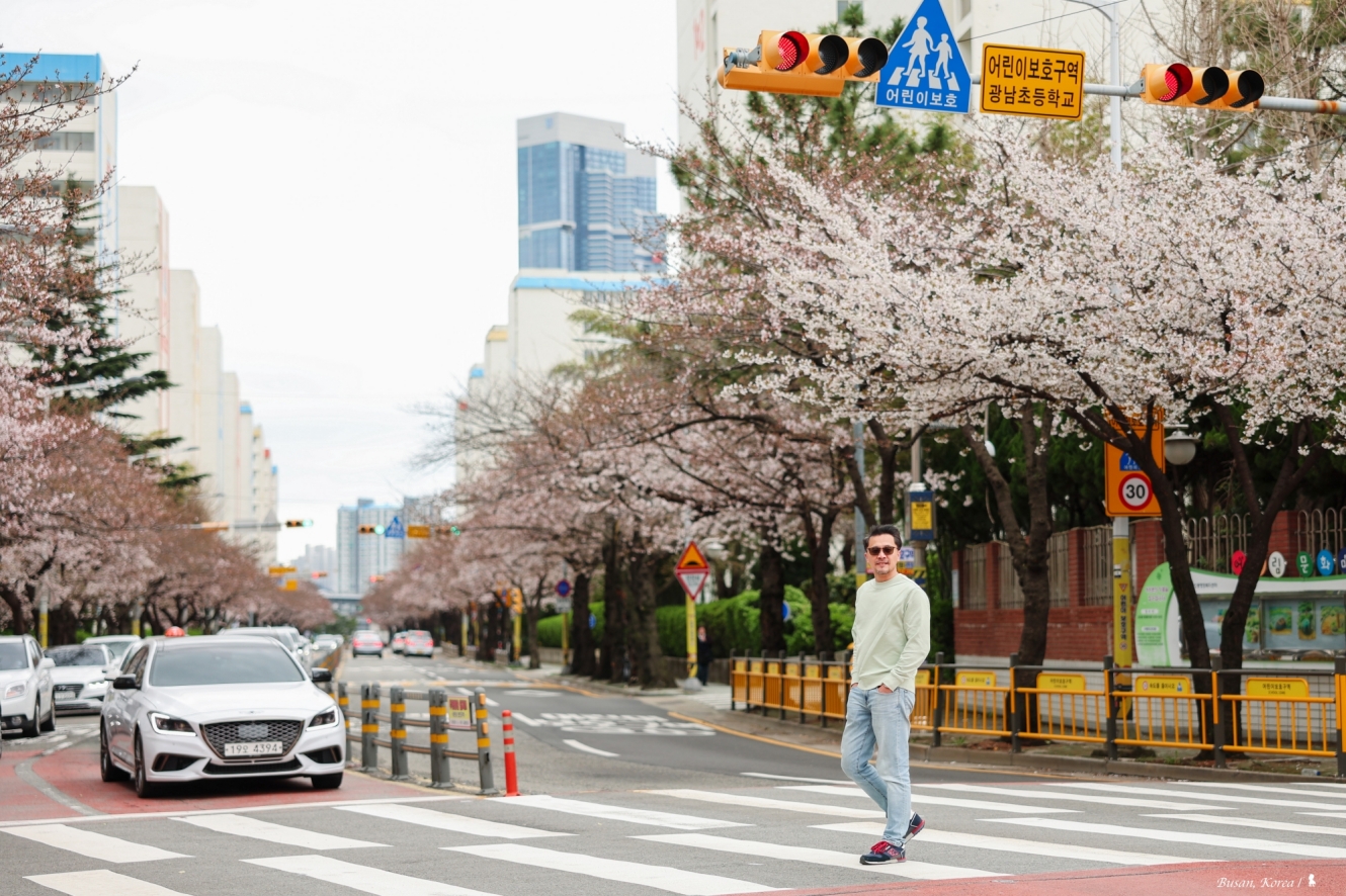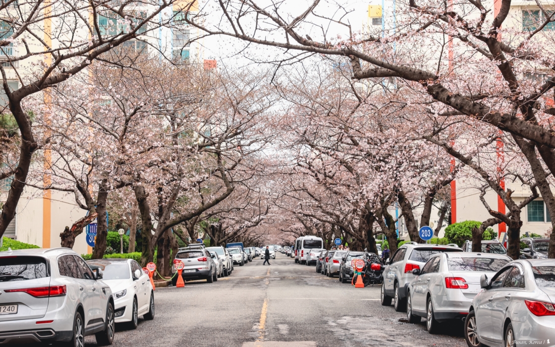 這個賞花景點讓我想到當年在春天造訪溫哥華,無需遠求、散步在一般社區就能賞櫻,位於釜山一處住宅區的南川洞櫻花路即是,兩邊是停車格的小路被櫻花樹夾道,在春天成了櫻花隧道;帶著相機再向大馬路走去,學校、街邊小攤還有韓文路牌,我更喜歡這樣多了在地氣息的櫻花風景,一條櫻花樹下的斑馬線,頓時也成了釜山版的粉紅艾比路。