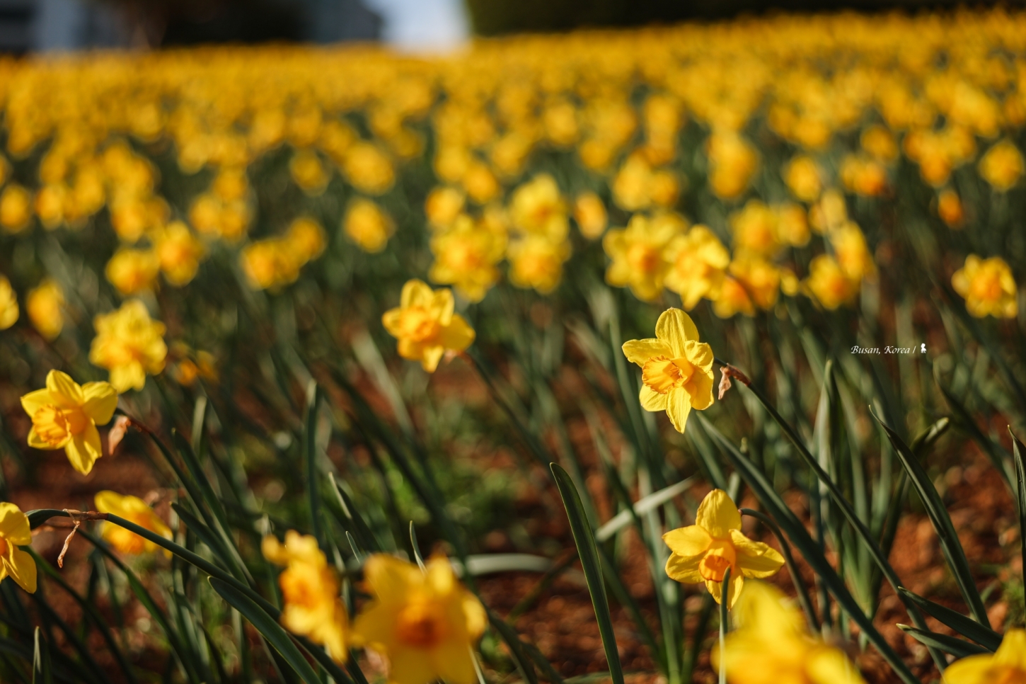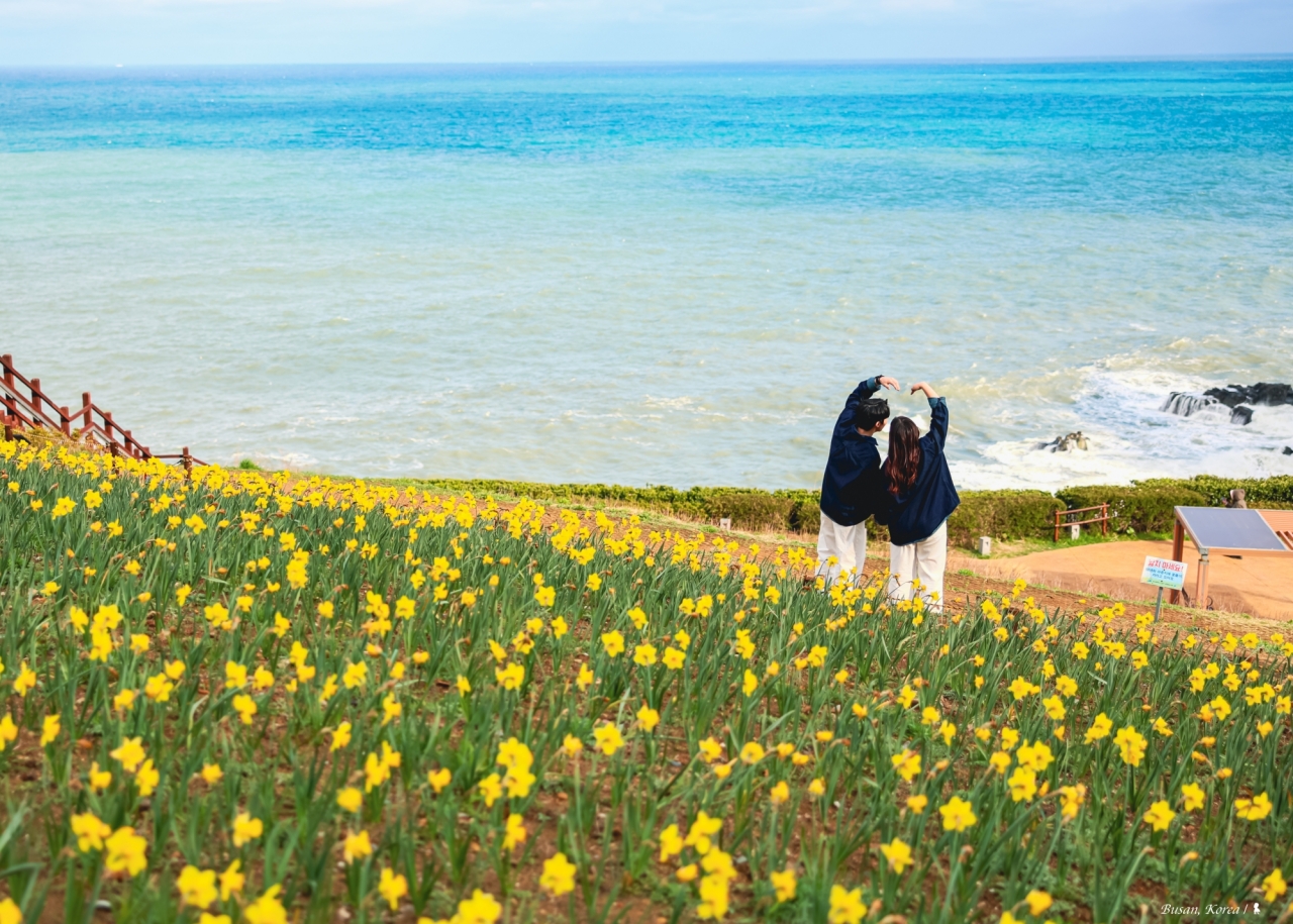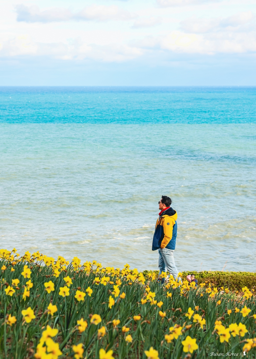 走完天空步道,推薦向後轉繼續拾階而上,春天的釜山迎日公園格外耀眼,以碧海藍天為背景,水仙花向大海鋪展而去,是季節限定的絕景。