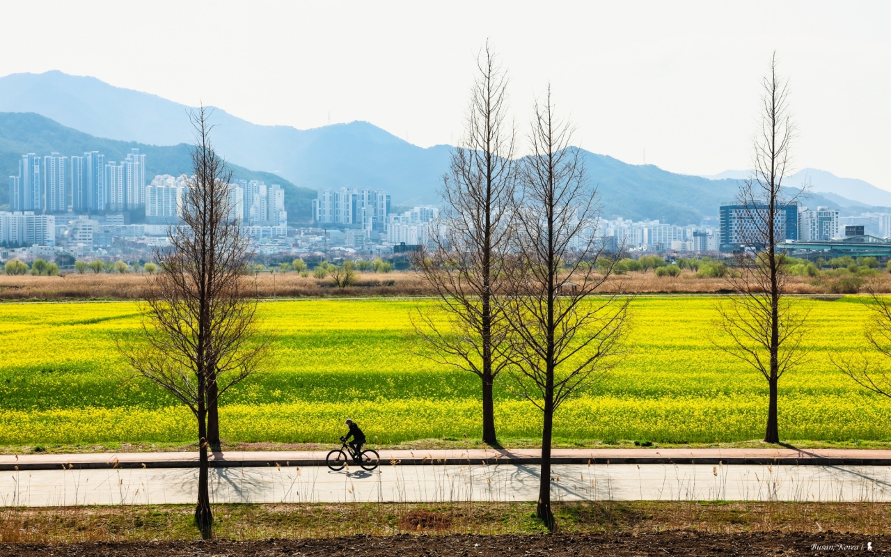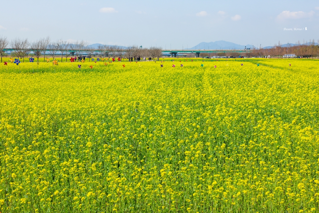 位於釜山江西區的大渚生態公園,每年到了三、四月,可同時欣賞櫻花與油菜花。推薦租一台單車,騎一小段延綿 30 里長的櫻花路,向下望,是廣達 76 萬平方米、約 63 個足球場大的油菜花田,能體會何謂大美!而每年四月初在這都會舉辦「釜山洛東江油菜花節」,以黃色花海為舞台,音樂演出、集團結婚以及各式活動在此熱鬧上演。