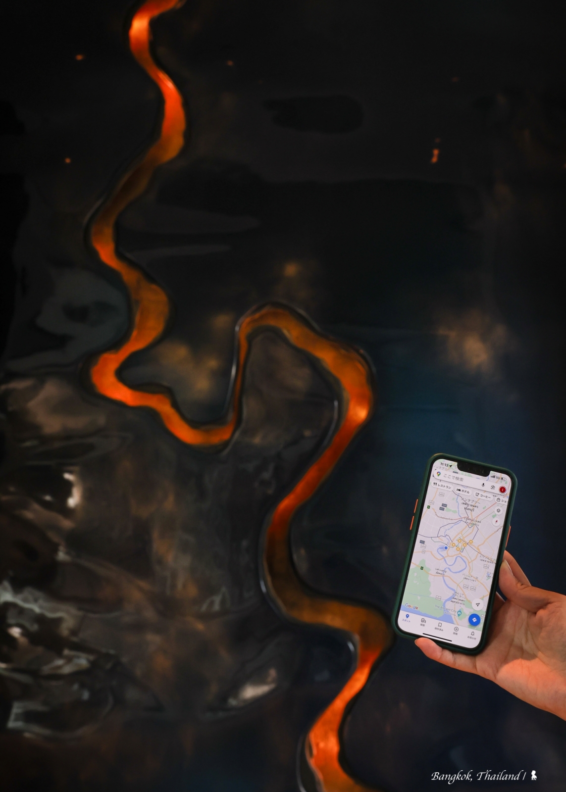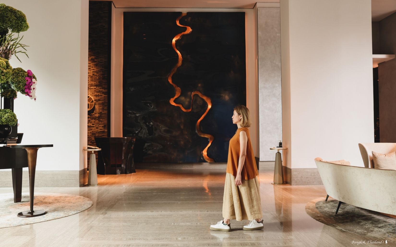入住期間某晚,我收到李欣的訊息說隔壁飯店很值得一看,相約隔天要去參觀。與曼谷嘉佩樂緊鄰的可也大有來頭,是「2023年全球50家最佳飯店」第 3 名的曼谷四季酒店,兩家設施是同個業主。相較於我們入住的嘉佩樂是讓人自在的居家風格,佔地較大的四季酒店顯得更為氣派。走進飯店大廳,視線自動被引導到一面金色蜿蜒的寫意藝術作品大牆上,忽然,李欣興奮的高舉手機在宣告她的發現,只見手機螢幕上的谷歌地圖上的某一段地形與牆上形狀是不謀而合,沒錯,藝術家用昭披耶河當成了創作靈感與題材,向住客說起了在地故事,我同樣佩服的是從事同領域工作的外甥女,能慧眼看見我們差點錯身而過的巧思。就這樣幾天下來,我們走著、讚嘆著、討論著入眼的飯店不凡設計,著實是欣賞之餘的一大享受!