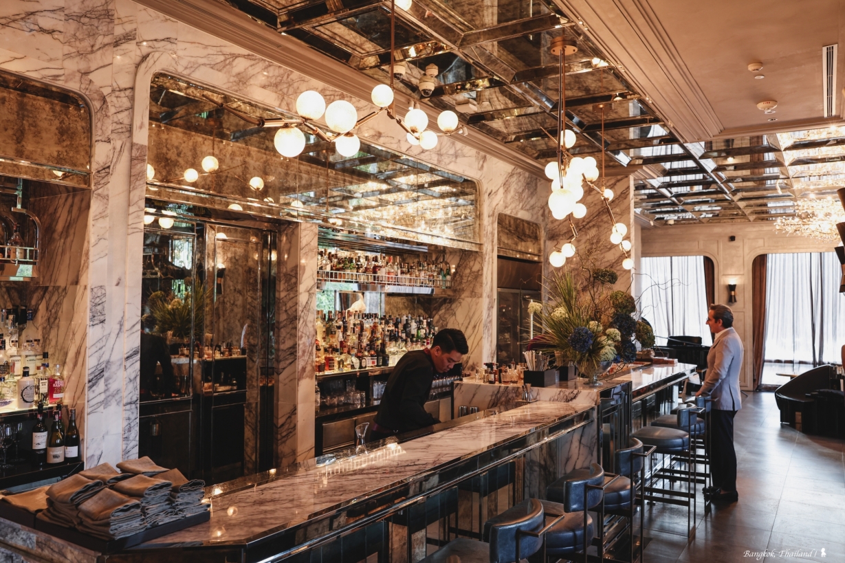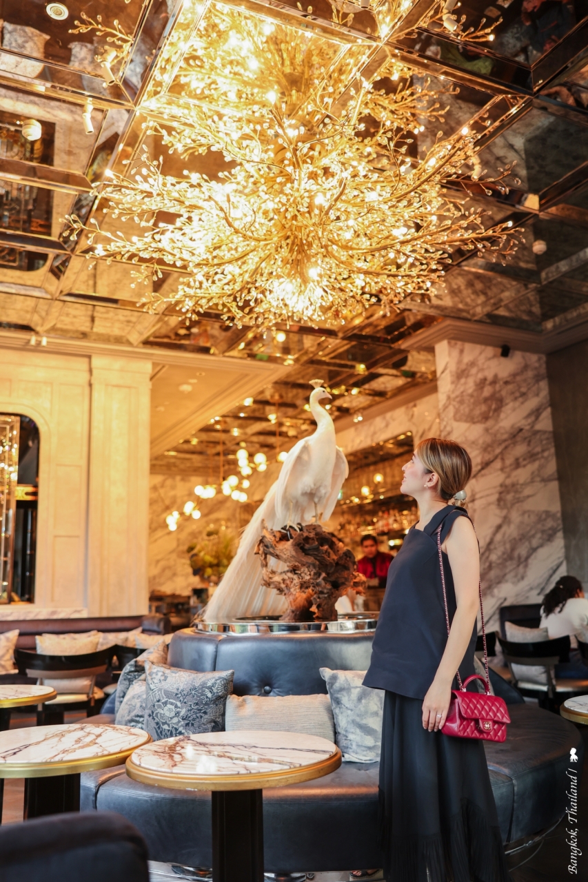 被譽為超五星的曼谷嘉佩樂酒店,不光擁有無價河景,在飯店各處用料與飾品選用也都沒手軟,若愛看設計,飯店的 Stella 酒吧必訪,特別是每天傍晚 5 到 6 點的「CIN CIN HOUR」更只對住客開放、大方提供調酒免費暢飲。奢華浮誇風的空間,帶些復古更有著東西方的美學碰撞,站在華美水晶燈下白孔雀旁的李欣,手指比著上方跟舅舅我說,這些水晶燈、壁畫、工藝木雕到吧台與天花板所使用的溶蝕鏡子,看得出來都花了不少錢在上頭。重點是,這錢花得華麗而不俗,顯見好品味。