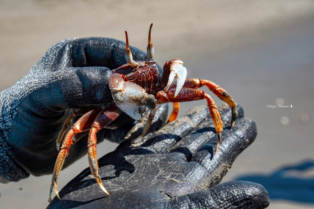 這片沙灘的生態豐富,轉頭就把注意力聚焦在眼前所見。在船長眼尖的帶領下,讓我們接連看到蛤蠣以及許多的迷你小蟹,幸運地還看到大隻的角眼沙蟹,船家也準備鏟子讓大家可以實際體驗。我坐在沙灘海景鞦韆上盪出了快四年前的回憶,想起了菲律賓薄荷島附近同樣也是一座沙丘島取名處女島,那份悠閒倒是有幾分相似。
