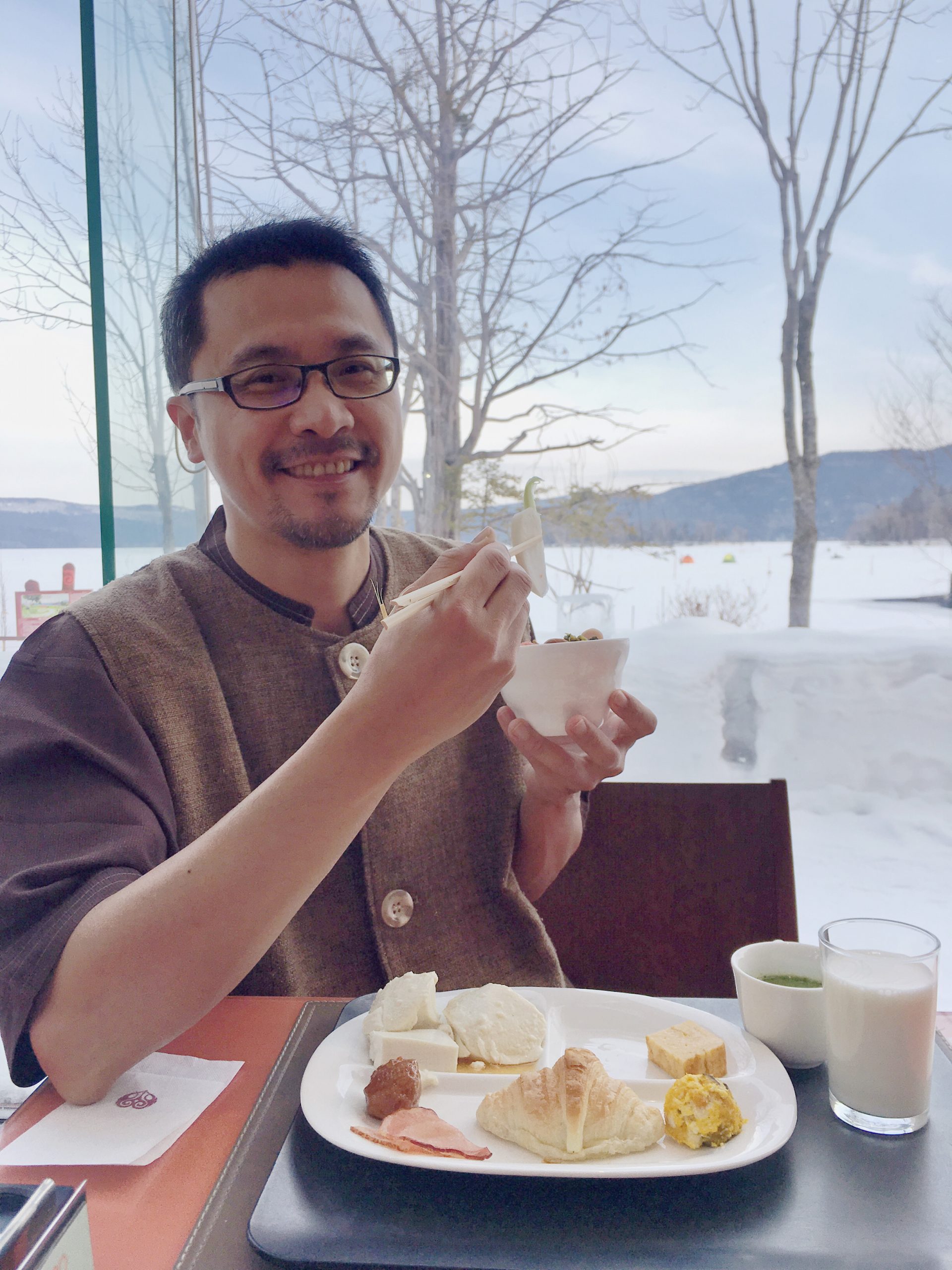 ⇑ 窗外是封凍的阿寒湖,在鶴雅之翼酒店吃到非常美味的清粥配當地漬物與阿寒川豆腐,如此早餐令人大滿足!